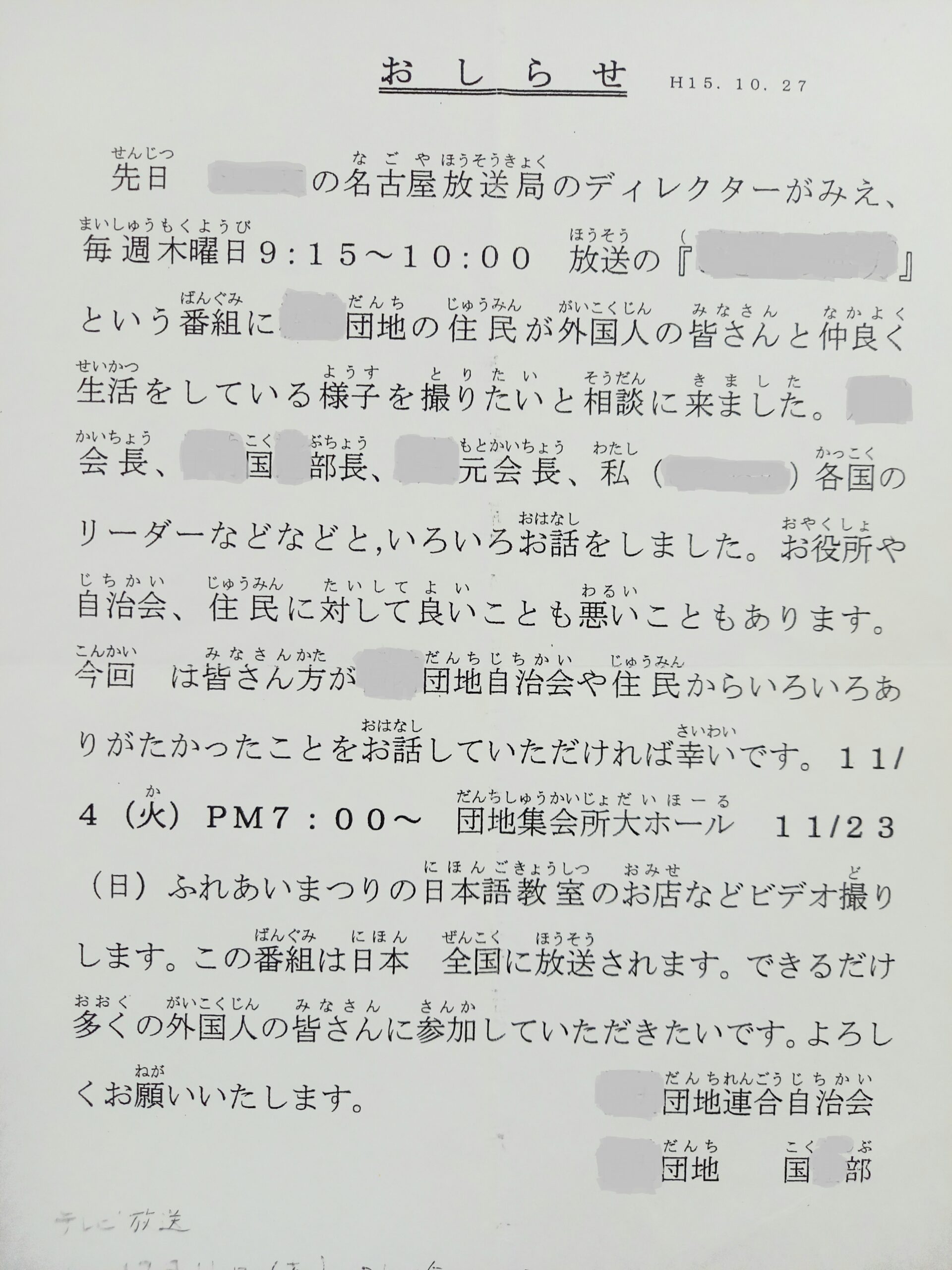 今振り返ってみると、当時の現場では、プロジェクトの「終わり」を予感させるような、様々な出来事が起こっていた。例えば、テレビ取材のエピソードは、「教室」を取り巻く空気が変化したことを、如実に表す出来事だった。団地に取材に来たテレビ局は、全国放送をてがける大手の放送局で、バラエティ番組の一部として、湘南団地の「教室」を取材に来た。番組では、「外国人問題」の解決策として、「湘南プロジェクト」の「日本語教室」の取り組みが紹介された。2003年10月27日の日誌に、一連の出来事についての記録が残されている。